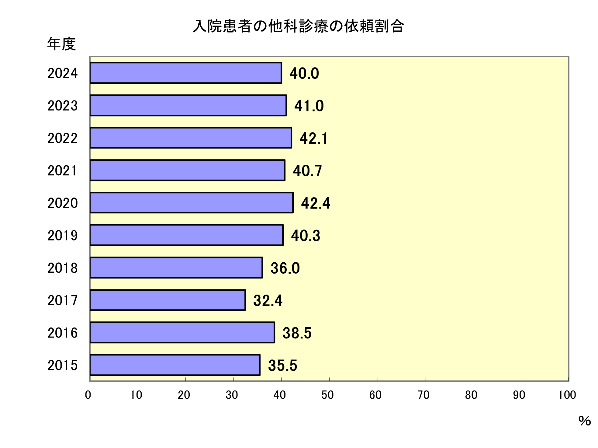 - 2024年度は40.0%と前年より1.0ポイント下がりました。2024年4月に耳鼻咽喉科が閉科しており減少の要因と考えられます。ただし、2019年以降は40%以上を保っており、専門科間の相談、コミュニケーションは維持されていると思われます。今後も専門科間の協力を進め、よりよいサービスの提供に努めたいと思います。