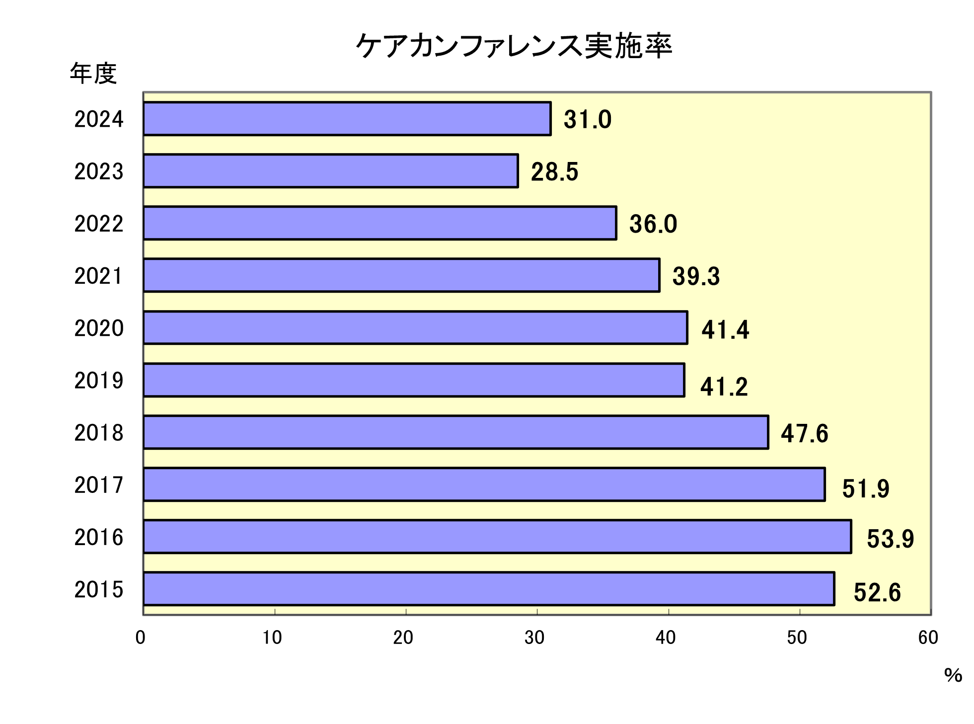 医師の治療方針を多職種で共有し、それぞれが専門的評価を行うことで、患者の状況を把握し、より適切な治療、社会的支援が推進されると思われます。しかし、2016年をピークに減少し続けていました。2024年度は事業所方針に「多職種カンファレンスの開催回数と参加者数の把握」を掲げ、病棟会議も再開し、前年よりは増加しています。しかし、全日本民医連の2024年の中央値、65.10%を大幅に下回っています。
