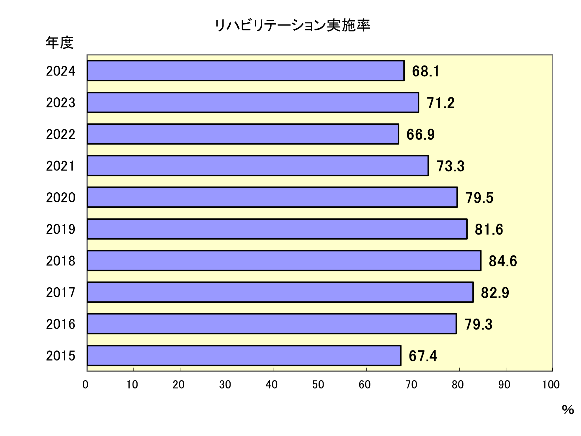- 2016年度以降リハビリテーション処方のシステム管理や診療体制などを整備し、実施率の拡大を図りました。2019年以降は対象者の拡大だけではなく、患者様1人1人へのリハビリテーション提供量が十分に確保できるよう、体制整備や学習を進めています。