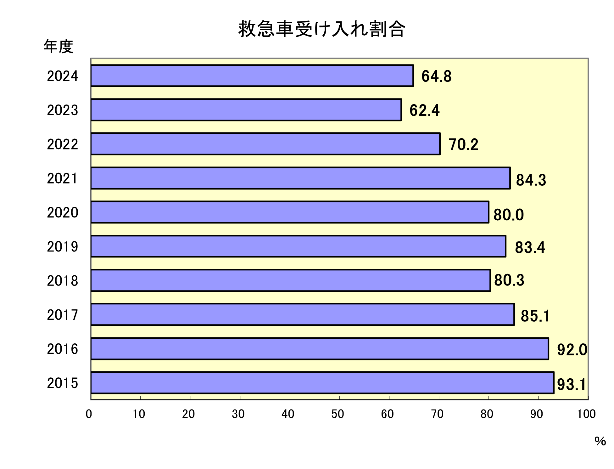 - 救急車受入割合は、救急隊からの搬送要請に対して、どれだけ救急車の受入が出来ているかを示す指標です。各病院の救急診療の評価、地域医療への貢献度を示す指標にもなります