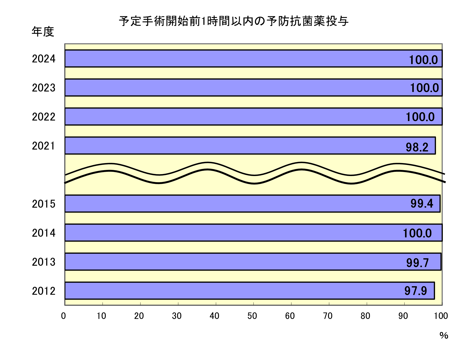 - 予定手術開始前1時間以内の予防抗菌薬投与については2011年から取り組みを開始しています。2024年度も投与が必要な手術に関しては100%投与できています。