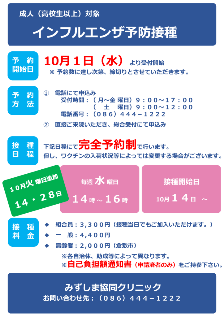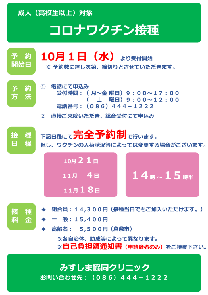 10月1日より、成人(高校生以上)対象のインフルエンザ・コロナワクチン接種の予約を開始します。完全予約制となりますので、電話またはクリニック1階総合受付にてお申込みください。