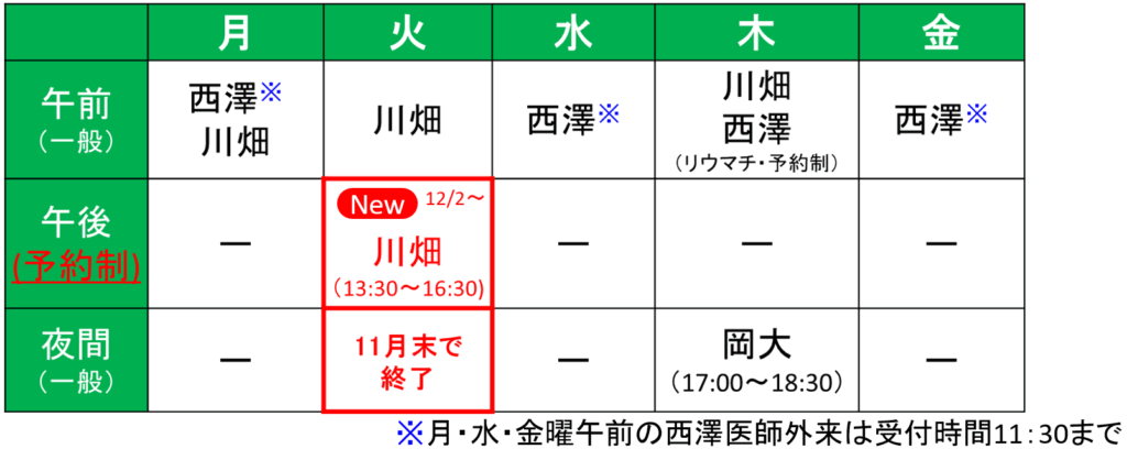 2025年12月2日(火)より、整形外科の診療時間を下記のとおり変更いたします。ご理解とご協力を賜りますようお願い申し上げます。【変更点】 整形外科 変更前:毎週火曜 夜間 17:00~ ↓ 変更後:毎週火曜 午後 13:30~16:30 ※予約制となります